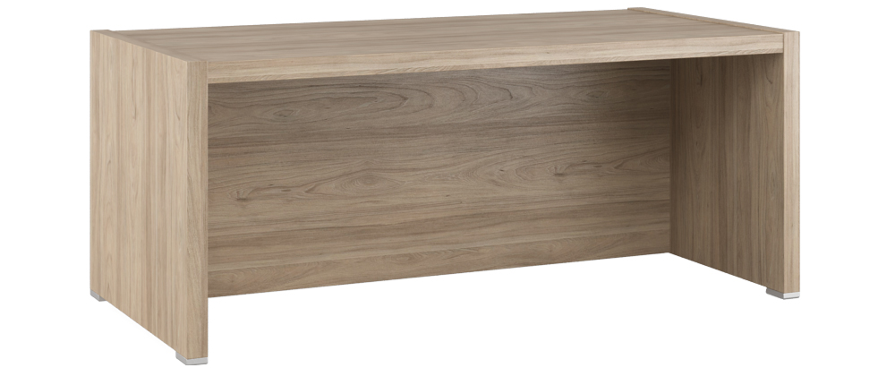 Стол руководителя на деревянных опорах. Габаритные размеры: Ширина: 1800±10 мм, Глубина: 880±10 мм, Высота: 750±10 мм. Столешница выполнена из ЛДСП. Опоры сплошные выполнены из ЛДСП. Опоры к столешнице крепятся с помощью эксцентриков. Опоры укомплектованы металлическими подпятниками. Царга у стола закрывает все расстояние от столешницы до пола, изготовлена из ЛДСП. Края столешницы и опор облицованы кромкой ПВХ.